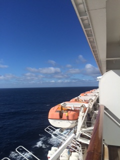 1. Hi L & G: Actually, we’re having a bit of “motion” this morning and it’s fun!! Grey skies outside, not the sun and warmth we were hoping for. (We’d ordered some last night, but I supposed that QM2 has its limits as to what it can give to its passengers. xox