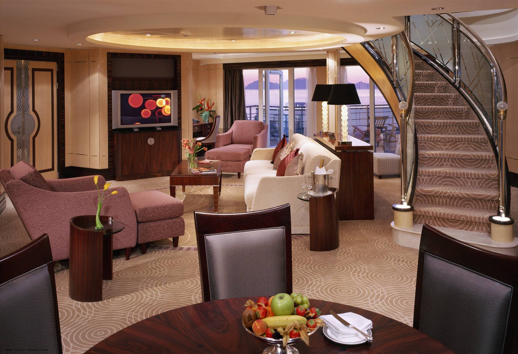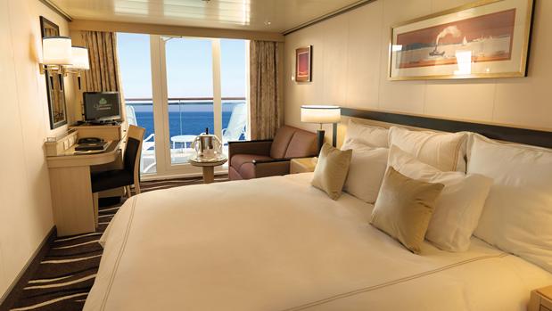 Almost all other passengers dine in the Britannia Restaurant, perhaps the most dramatic location on the ship: a grand two-story dining venue. Here, you are assigned either an early or late seating, each of which serves up to 1,100 passengers at a time. Let’s say that, while you’ll eat well in Britannia, your dining experience will be decidedly different than in the Queens or Princess Grills. Britannia cabins are typically between 248 sf for a cabin with balcony to an inside cabin, which measures about 159 sf (which is about smaller than the closet space in the Grand Duplex).