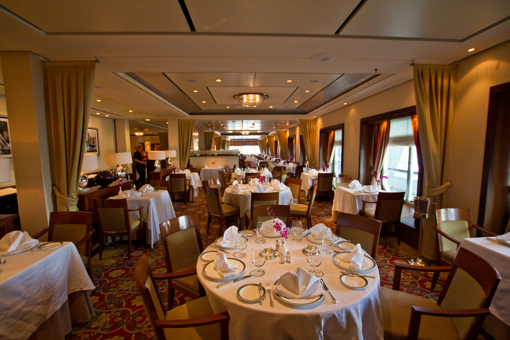 The “first class” option is the Queens Grill cabins. These cabins, all with private balcony, range from the standard 506 sf option to the fabulous Grand Duplexes that are 2,249 sf. All of these cabins include butler service and other lovely amenities. All Queens Grill passengers (about 200 in all) dine in – where else? – the Queens Grill, located on deck 7, starboard aft. You are given a designated table which is yours’ for the entire voyage. For dinner, there is no early or late seating – you show up when you like – typically 6:30 – 9:00 PM. The menu here is the most luxe on the ship and it’s here that the caviar flows, if caviar is your thing (it’s definitely NOT AAC CPA’s thing). You also have the same service staff and they are VERY accommodating. The Senior Maitre d’Hotel, Osman, actually remembered us from our last voyage, and made sure that we had a swell time. Which we did.