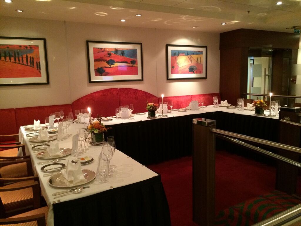 As a possible dining alternative, I’d like to share with you one of our favorite places to eat on the ship: Todd English, which is the specialty restaurant on board. Intimate and with its own chef, menu and wine list, it’s a delightful way to spend an evening. There is a modest surcharge of $30 per person to eat there but, believe me, it’s more than worth it. We dined there twice during our voyage and had a superb meal each time. It’s also open for lunch and for $12, you can have a delicious panini.